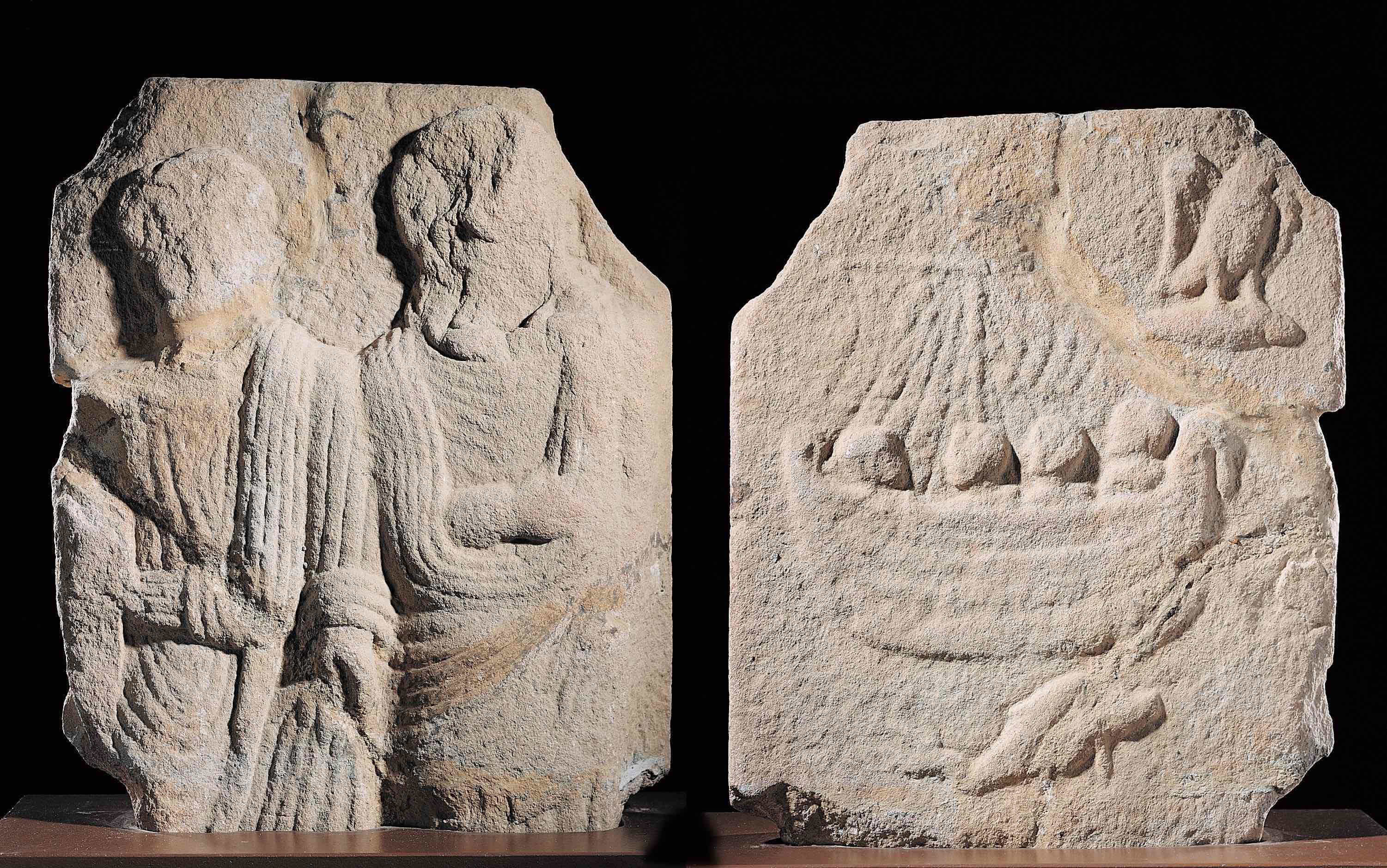 En el reverso se representa un barco navegando a vela con cuatro personas a bordo, un águila y un delfín. Estos dos últimos elementos tienen sobre todo un carácter simbólico que alude al mundo de los muertos. El barco posiblemente haga referencia al medio para trasladar los difuntos al Más Allá, aunque por tratarse de una nave de carga de pequeño tamaño también se pensó que podría hacer alusión a la profesión del difunto, tal vez marino o comerciante.